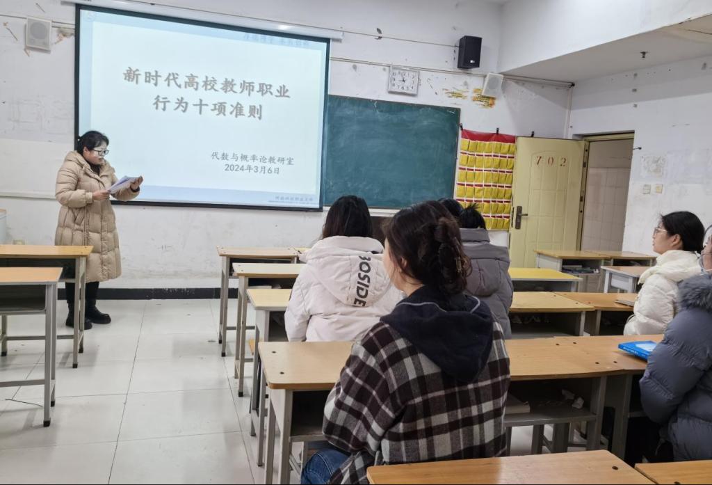 3月6日上午9点代数与概率论教研室于综合楼702教室集中学习、研讨交流、自主学习等形式,开展了《新时代高校教师职业行为十项准则》学习活动。教师们纷纷表示,要在深入学习的基础上,结合本教研室工作实际,争做新时代好老师。